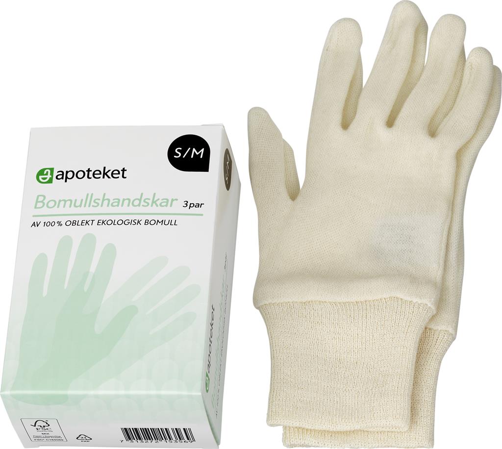 Apoteket Bomullshandskar i storlek S/M är mjuka och bekväma handskar tillverkade av 100 % oblekt ekologisk bomull. De lämpar sig väl som innerhandskar, för att absorbera fukt eller som skydd efter applicering av kräm eller salva, exempelvis över natten. Handskarna kan också användas som ett tunt isolerande lager mot kyla.