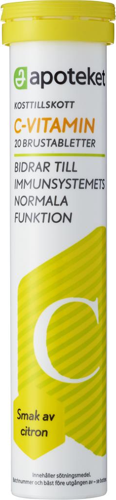 Apoteket C-vitamin brustablett är ett kosttillskott innehållande C-vitamin. Apoteket C-vitamin finns i 5 olika smaker: apelsin, citron, grönt äpple, blåbär och ingefära/apelsin. Vegansk.