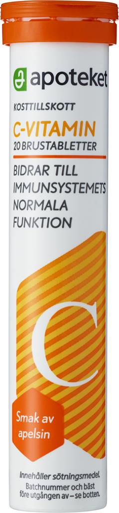 Apoteket C-vitamin brustablett är ett kosttillskott innehållande C-vitamin. Apoteket C-vitamin finns i 5 olika smaker: apelsin, citron, grönt äpple, blåbär och ingefära/apelsin. Vegansk.