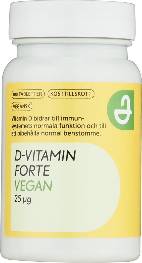 Apoteket D-vitamin Forte Vegan är ett veganskt kosttillskott i tablettform som innehåller 25 µg vitamin D3 (kolekalciferol från lav) per tablett. D-vitamin bidrar till immunsystemets normala funktion samt till att bibehålla normal benstomme, normal muskelfunktion och normala tänder. Produkten har gått igenom Apotekets kvalitetskontroll och är tillverkad i Sverige. Förpackningen är tillverkad av 100 % återvunnen plast.