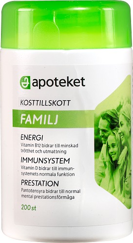 Apoteket Familj är ett kosttillskott anpassat för familjen med barn från 10 år. Den ger ett allsidigt tillskott av 13 vitaminer och 10 mineraler.