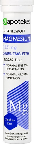 Apotekets Magnesium är brustabletter som innehåller magnesium varav 90% kommer från magnesiumcitrat. Magnesium bidrar till normal energiomsättning och muskelfunktion, samt till att minska trötthet och utmattning. Produkten är vegansk. Kosttillskott ersätter inte en varierad kost utan bör kombineras med en mångsidig och balanserad kost samt en hälsosam livsstil.