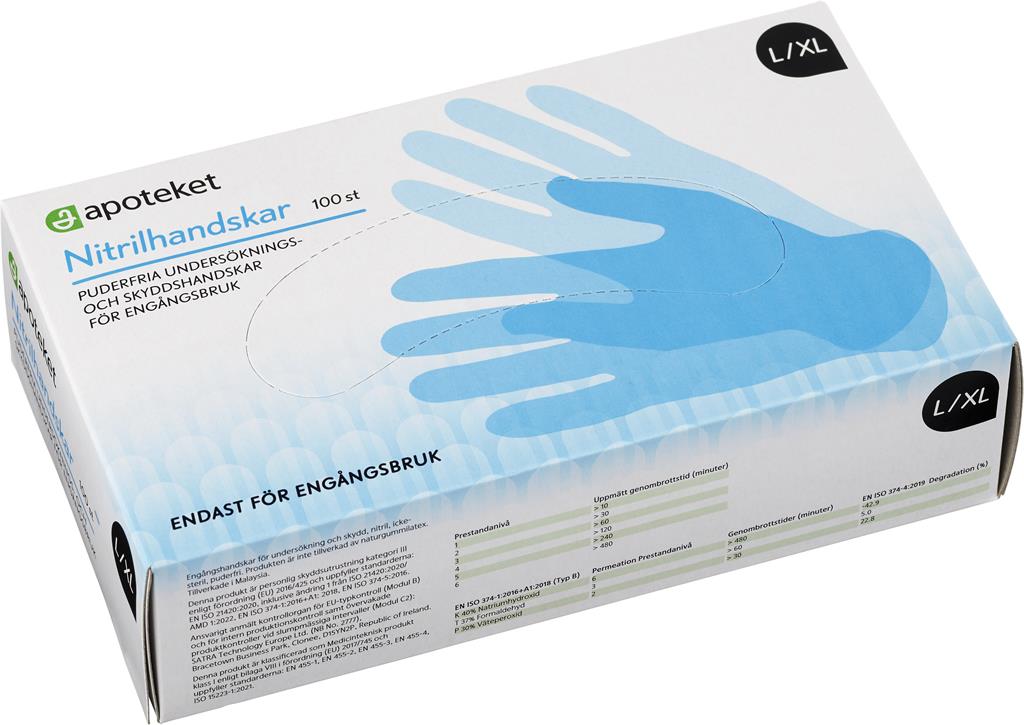 Apotekets nitrilhandskar är puderfria engångshandskar avsedda för undersökning och skydd vid olika typer av moment i hemmet eller inom vård. Handskarna är icke-steril, tillverkade i nitril och är fria från naturgummilatex, vilket gör dem lämpliga för personer med latexallergi. Storlek L/XL, 100 st per förpackning.