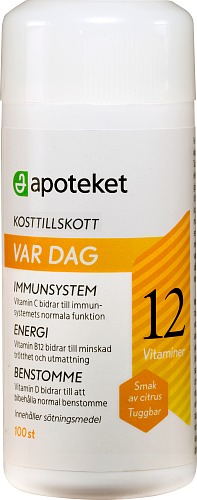 Apoteket Var dag är ett kosttillskott anpassat för vuxna och barn från 7 år som vill ha ett kosttillskott med endast vitaminer. Apoteket Var dag innehåller 12 vitaminer, bland annat Vitamin C som bidrar till immunsystemets normala funktion. Vitamin B12 som bidrar till minskad trötthet och utmattning samt vitamin D som bidrar till att bibehålla normal benstomme.