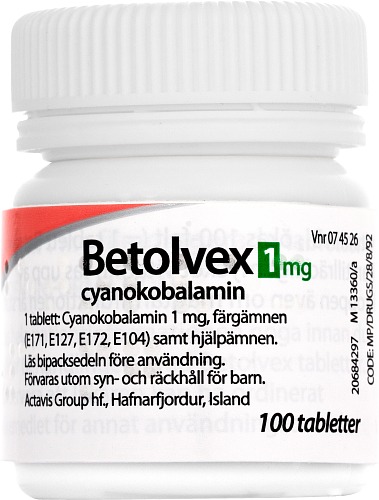 Betolvex är ett receptfritt läkemedel som innehåller vitamin B12. Vitamin B12 bidrar till normal celldelning, blodbildning och ett normalt fungerande nervsystem. Betolvex ges vid brist på vitamin B12 eller då det finns en risk för att brist på vitamin B12 ska uppstå.   Magsårsoperationer och läkemedel kan bidra till brist på B12. Läs bipacksedeln noga före användning.