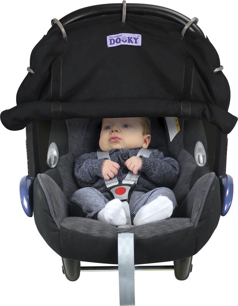 typer av barnvagnar och babyskydd. Dooky skyddar mot sol, vind, regn & snö.