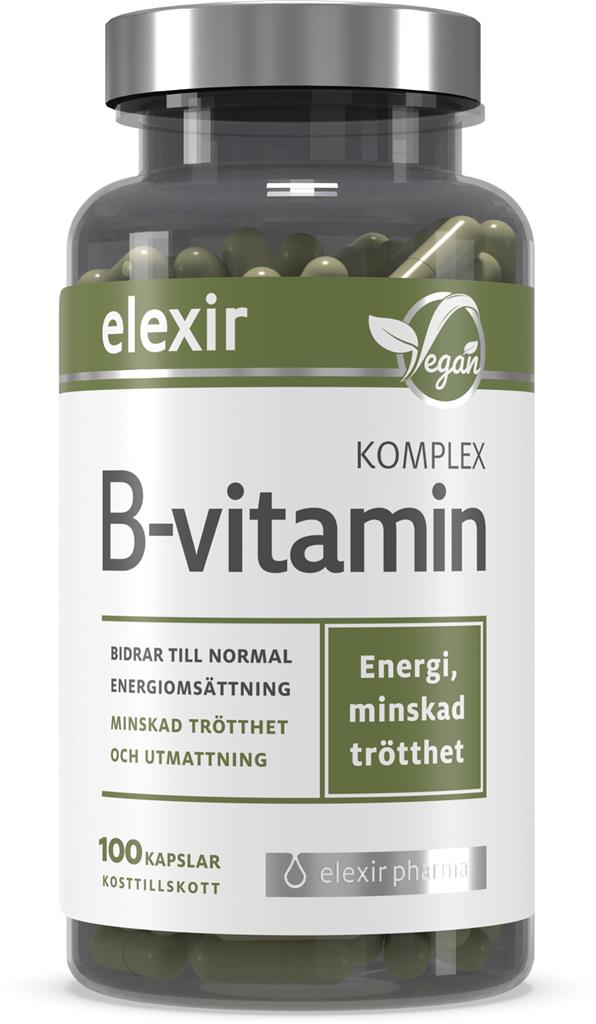 Elexir B-vitaminkomplex innehåller samtliga B-vitaminer. En kapsel täcker dagsbehovet. B-vitaminer ingår i kroppens energiomsättning – B5, B6 och B12 bidrar till minskad trötthet, B7 bidrar till normal kvalitet av hår och hud. Produkten är vegansk.