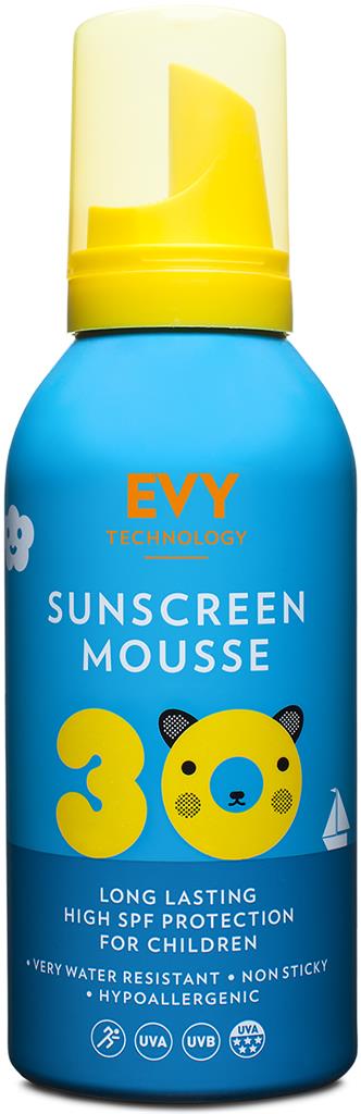 EVY Kids SPF 30 passar hela familjen men är ett idealiskt skydd för barn då de behöver ett intensivt och vattenfast solskydd. Som alla EVY´s produkter är barnformulan en mild och hypoallergen med högsta möjliga UVA-skydd. Moussen är lämplig för små barn från 12 månader. Den är kladdfri och bildar ingen hinna utan tillåter huden att andas fritt. Moussen absorberas snabbt och innehåller inga konserveringsmedel, parfymer eller nanopartiklar. EVYs grundformula är en svensk patenterad uppfinning som fördelas i hela översta hudlagret istället för att lägga sig på ytan. Solskyddet försvinner därför inte vid bad, svett eller påfestningar och ger ett långvarigt skydd. EVY förstärker hudens naturliga barriär och rekommenderas av hudläkare/hudterapeuter till personer med soleksem/allergi och har utsetts till det säkraste solskyddet av Vitiligoförbundet. EVY´s produkter är allergitestade och fria från konserveringsmedel och parfym. Aerosolflaskan garanterar en bakteriesäker och fräsch produkt som håller sig som ny tills flaskan är helt slut.