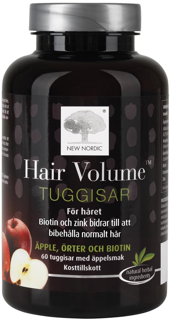 Hair Volume™ Tuggisar är ett kosttillskott som innehåller biotin och zink som bidrar till att bibehålla normalt hår, hud och naglar.