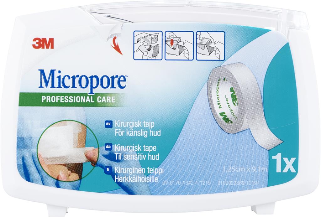 Lämplig för fixering av gasbinda och dylikt på ömtålig och känslig hud, som till exempel ansikts- och ögonförband och vid upprepade påläggningar med tejp. Micropore används också vid småsår, på suturer samt för ömtålig babyhud. Micropore har ett hudvänligt lim som låter huden andas och avlägsnas enkelt och smärtfritt.