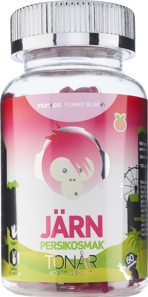 Monkids Järn Tonår är ett kosttillskott för tonåringar som innehåller dagsbehovet av järn i 2 gummies. Järn bidrar till normal bildning av röda blodkroppar och hemoglobin. Järn bidrar även till att minska trötthet och utmattning. Välsmakande mjuka gummies med naturlig persikasmak. Produkten är vegansk. Från 12 år.
