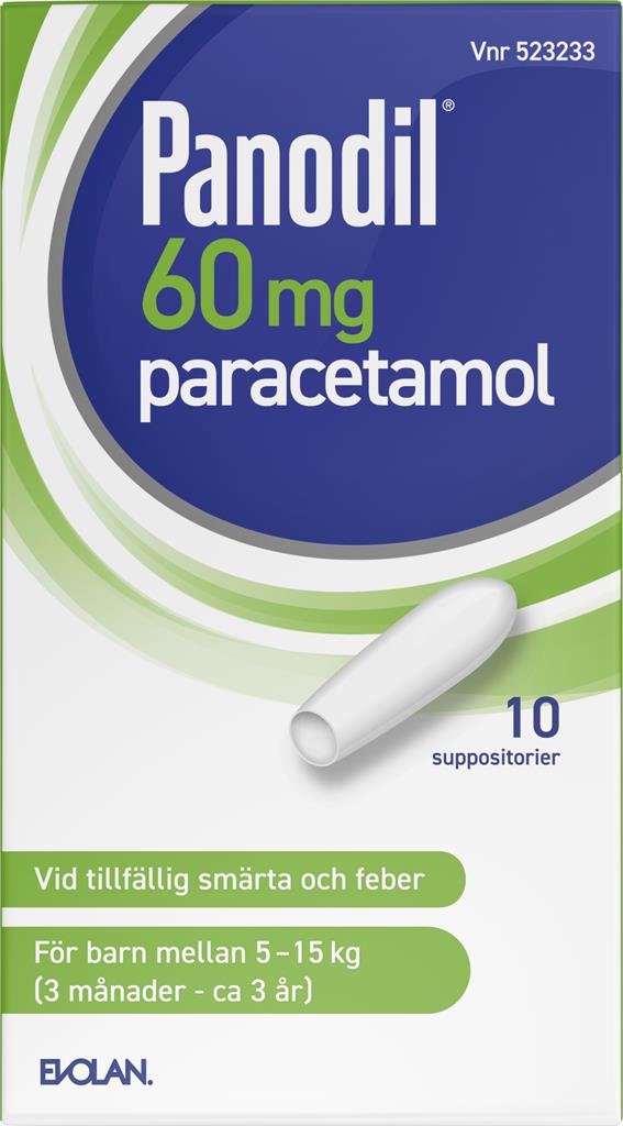 - Vikt 5–10 kg: 1 suppositorium (60mg) var 4–6 timme,