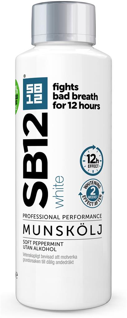 SB12 White munskölj med whiteningeffekt. Minskar missfärgningar från till exempel kaffe, te, rödvin och nikotin och skyddar mot uppkomsten av nya missfärgningar, utan att skada emaljen. Neutraliserar dålig andedräkt med effekt i 12 timmar. Innehåller fluor. Följ anvisningarna på produkten/bruksanvisningen.