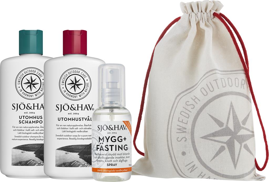 Sjö&Hav Sommarkit 1 består av tre utvalda hygienprodukter unikt utvecklade för utomhusbruk. Produkterna kommer i en bomullspåse med dragsko. Sjö&Hav Sommarkit 1 innehåller Utomhustvål 200 ml, Utomhusschampo 200 ml, Mygg+Fästing Spray 75 ml. Svensktillverkade. Lätt biologiskt nedbrytbara för minimal inverkan på känslig miljö.