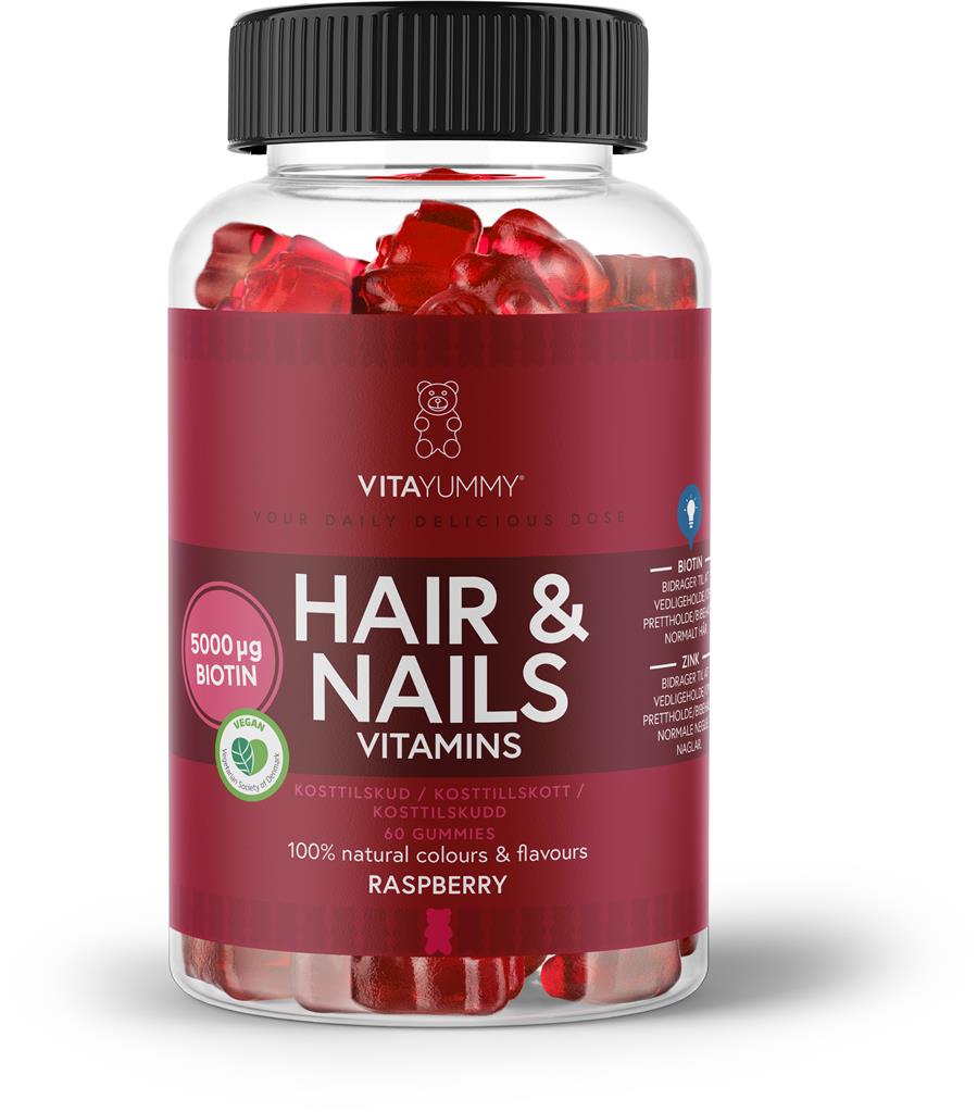 VitaYummy Hair & Nails är ett vegansk kosttillskott som innehåller flera vitaminer. Kosttillskottet är välsmakande vingummi för vuxna och innehåller bland annat biotin som bidrar till att bibehålla normalt hår, naglar samt bidrar till normal energiomsättning. Vingummi i form av björnar innehåller även vitamin A som bidrar till att bibehålla normal syn, hud och slemhinnor, och D vitamin som bidrar till att bibehålla normal benstomme, tänder och muskelfunktion. Produkten innehåller även vitamin B6 och B12 som bidrar till att minska trötthet och utmattning. Med god smak av hallon och fri från konstgjorda färger.