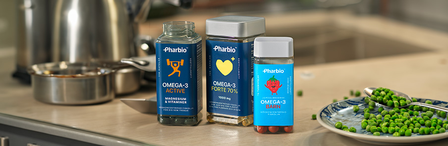 Livsmedelsverket rekommenderar att vi bör äta fet fisk 2-3 gånger i veckan. Tycker du att det är svårt att få i dig omega-3 via din kost? Då skulle du kunna testa att komplettera med ett tillskott. Pharbio har förutom vitaminer och mineraler också ett brett sortiment av lättanvända kosttillskott med omega-3 anpassade för olika behov och livsstadier.